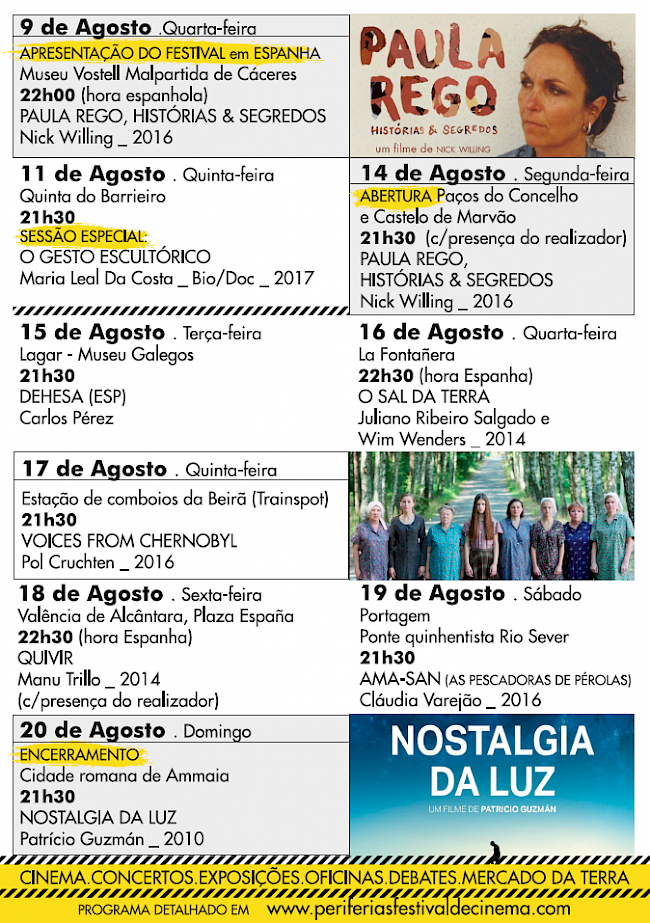 Dentro do espírito de itinerância que caracteriza o festival, é intenção marcar presença no maior número de locais possíveis, tanto no concelho de Marvão, como do lado de lá fronteira, contando com o apoio do Município de Valência de Alcântara e a importante parceria com a Filmoteca da Extremadura. O objectivo é dar a ver lugares e vivências que merecem ser conhecidos, planeando sempre momentos multidisciplinares, onde, a par do cinema, a música, a fotografia, as diferentes artes e ofícios marquem presença.