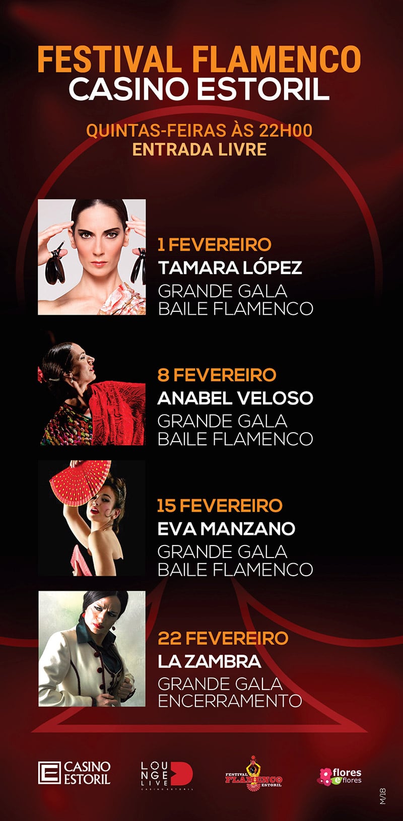 Este ano o Casino Estoril aposta por um Ciclo de Baile Flamenco e pela vinda a Portugal das artistas Tamara López, Anabel Veloso, Eva Manzano e La Zambra, que vão estar no casino nas quintas-feiras 1, 8, 15 e 22 de fevereiro às 22h.