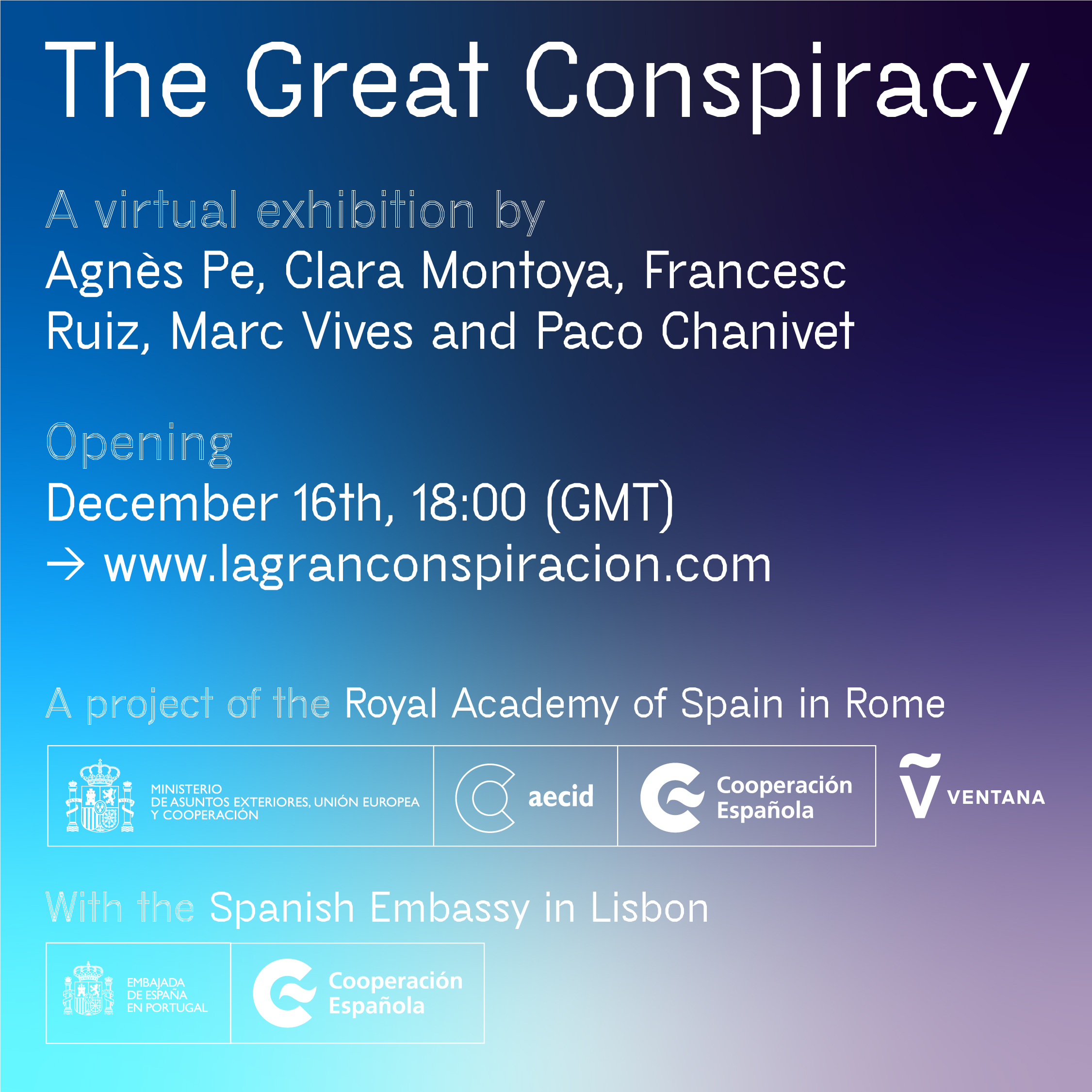 Em resposta às dificuldades vividas pelas artes visuais como resultado da crise do COVID-19, a Agência Espanhola de Cooperação Internacional para o Desenvolvimento (AECID), apresenta no dia 16 de dezembro o projeto de exposição La Gran Conspiración. Esta proposta surge sob a coordenação da Real Academia de Espanha em Roma com a colaboração das Seções Culturais das Embaixadas da Espanha em Bruxelas, Lisboa, Londres e Washington e o Centro Cultural de Espanha em Montevidéu, como espaço de experimentação de práticas artísticas a distância. Esta exposição faz parte do Programa VENTANA de conteúdos digitais promovido pela AECID.